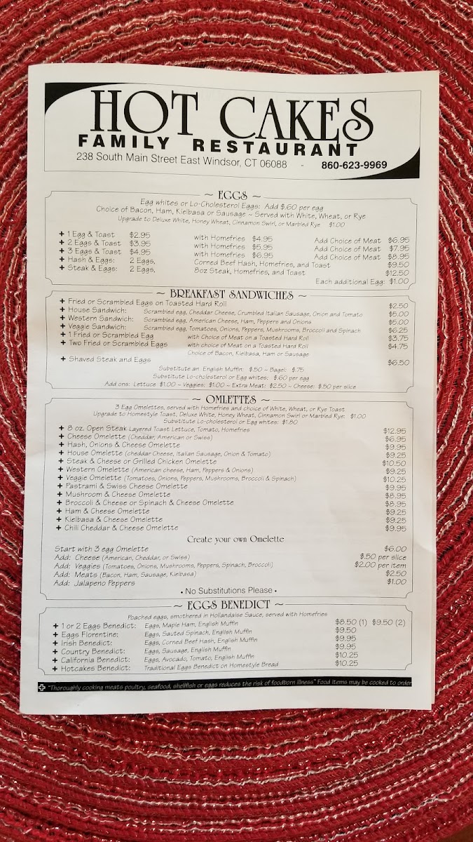 Welcome to Hotcakes Family Restaurant, where comfort meets culinary delight. Located at 238 S Main St, East Windsor, CT, this family-owned gem offers a breakfast haven for all. The menu features a remarkable selection of omelettes, including the House Omelette with Italian sausage and the Western Omelette packed with ham and peppers, ensuring there's something for every palate. For breakfast burrito lovers, options like the hearty Hotcakes Special showcase a delightful mix of meats and cheese.
